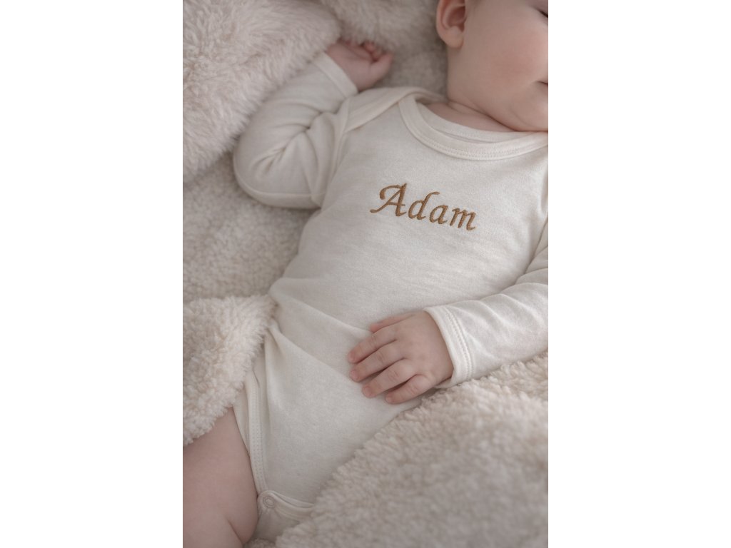 Bodýčko se jménem je krásný osobní kousek pro miminko i milý dárek k narození. Jméno je vyšívané s důrazem na jemnost a kvalitu, aby bylo příjemné na nošení a vydrželo i časté praní.