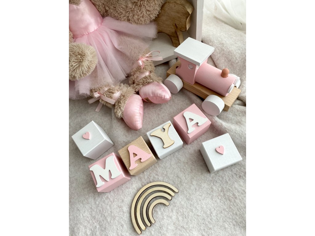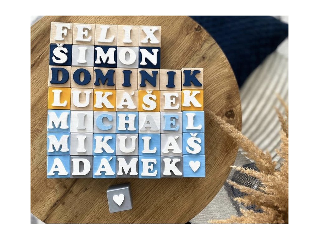 Personalizované dřevěné kostky vyrábím z masivního bukového dřeva o velikosti 4 × 4 cm. Každou kostičku i písmenko ručně maluji přesně podle vaší objednávky.