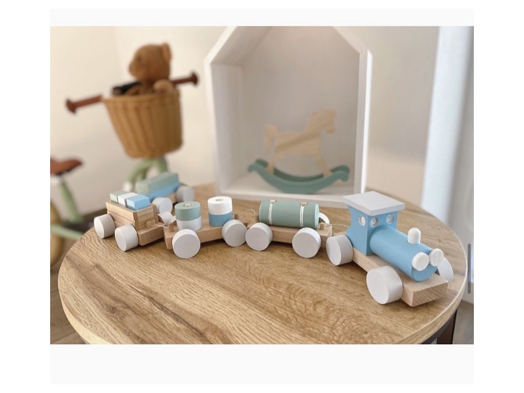 Vláček je v barvě baby modrá, mint, světle šedá, bíla a přírodní dřevo.